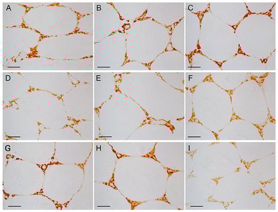 The immunohistochemical analysis of the distribution of LH/hCG-R in the seminiferous Table 5. (B)—CT5, (C)—CG5, (D)—D5, (E)—DT5, (F)—DG5, (G)—DM5, (H)—DMT5, (I)—DMG5. Scale bars, 100 µm.