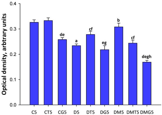 The optical density for LH/hCG-R immunostaining in the testis of control and diabetic rats, and the effect of metformin and LH/hCG-R-agonists treatment. a—the difference between the C5 vs. D5; b—the difference between the D5 vs. DM5; c—the difference between the D5 vs. DT5 and DM5 vs. DMT5; d—the difference between the C5 vs. CG5 and DM5 vs. DMG5; e—the difference between the CT5 vs. CG5, DT5 vs. DG5 and DMT5 vs. DMG5; f—the difference between the CT5 vs. DT5 or DMT5; g—the difference between the CG5 vs. DG5 or DMG5; and h—the difference between the DG5 vs. DMG5 are significant at p < 0.05. The data are presented as the M ± SEM, n = 5 (10 measurements in each case).