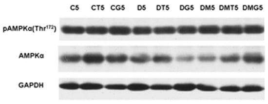 In the testes of diabetic rats, the immunochemical content of α-AMPK tended to decrease, although the differences from the control were not significant (p > 0.05). The content of α-AMPK in the DT5 and DG5 groups also showed a tendency to decrease, but in this case the differences with the corresponding control groups were not significant (p > 0.05) (Figure 9, Table 7). MF treatment did not change the enzyme content in comparison with the diabetic group, but the α-AMPK expression in the DM5 group was significantly lower than in the control (Figure 9, Table 7). To assess the degree of enzyme activation, the ratio of Thr172-phosphorylated (active) α-AMPK to the total α-AMPK is usually used. In our case, a significant increase in this ratio was observed in the DM5 group (Figure 9, Table 7). However, in this group, the content of total α-AMPK was reduced, which negates the significance of an increase in the ratio of the phosphorylated and total α-AMPK. In addition, the evaluation of the ratios of Thr172-phosphorylated α-AMPKA and the reference protein GAPDH did not reveal significant differences between the studied groups (Table 7). These data indicate that there is no significant effect of MF treatment on testicular AMPK activity and do not support the possibility of MF- or LH/hCG-R-agonist-mediated enzyme hyperactivation.