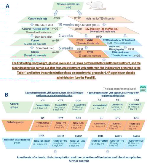 At the first stage, rats with T2DM were randomized into two groups: untreated diabetic animals (Diabetes, n = 30) and diabetic rats treated for five weeks with MF at a daily dose 120 mg/kg (orally using a gavage) (Diabetes + MF, n = 30) (Figure 10). Control animals (Control, n = 30) instead of MF for five weeks received 0.9% NaCl solution (saline), the solvent of this drug. Four weeks after starting MF treatment, in all the investigated groups the GTT was performed, and the blood samples were taken to measure the levels of glucose, HbA1c, hormones and lipids. At the next stage, all animals were randomized into groups for one-day or five-day treatment with the LH/hCG-R-agonists. Five-day treatment with TP3 (i.p., DMSO, 15 mg/kg/day) and hCG (s.c., saline, 15 IU/rat/day) was carried out from the 31st to the 35th days of MF treatment, while a single injection of LH/hCG-R-agonists at the same doses was carried out on the 35th day of MF treatment (the final day of the experiment). The choice of drug doses was based on preliminary studies of the “drug dose-steroidogenic effect” relationship. The selected doses of TP3 and hCG corresponded to their doses, which caused 60–65% of the maximum steroidogenic effect of the drugs when they were administered once to three-month-old male rats. Groups of rats without administration of LH/hCG-R-agonists received DMSO (150 μL, i.p.). Earlier, we showed that a five-day administration of DMSO to rats, even in a larger volume (200 μL, i.p.), does not affect their metabolic and hormonal parameters and testicular function [38].
