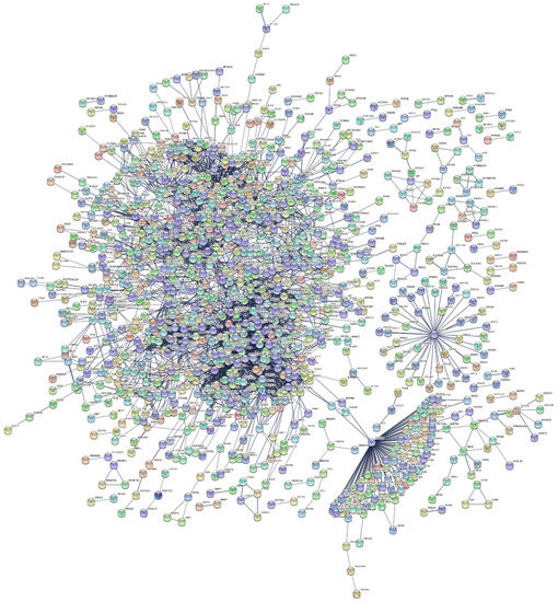 Regarding T2DM, in order to elucidate further the function of the 1211 genes, we constructed a PPI network that included 1197 nodes and 1313 edges, with an average node degree of 2.19, by using the STRING database and Cytoscape software (Figure 3). The PPI enrichment p-value was <1.0 × 10−16, which means that the network had significantly more interactions than expected.