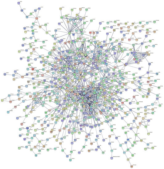 Regarding T1DM, in order to further elucidate the function of the 1827 genes, we constructed a PPI network that includes 1779 nodes and 3761 edges, with an average node degree of 4.23 by using the STRING database and Cytoscape software (Figure 2). The PPI enrichment p-value was 6.78 × 10−12, which means that the network had significantly more interactions than expected.