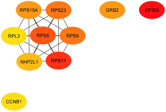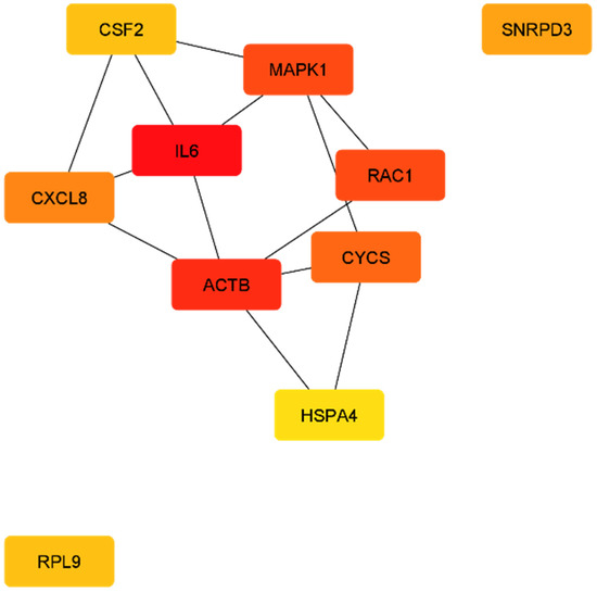 The protein network analysis by the CytoHubba plugin revealed the following 10 genes as the nodes with the most interactions in T1DM-DN: EP300, RPS11, RPS5, RPS23, RPS9, GRB2, RPS15A, NHP2L1, CCNB1, and RPL3 (Table 5 and Figure 4). In T2DM, the 10 genes with the most interactions in the protein network are: IL6, ACTB, MAPK1, RAC1, CYCS, CXCL8 (IL8), SNRPD3, CSF2, RPL9, and HSPA4 (Table 5) (Figure 5). In Table S2, we report the next top 10 genes per diabetes type.