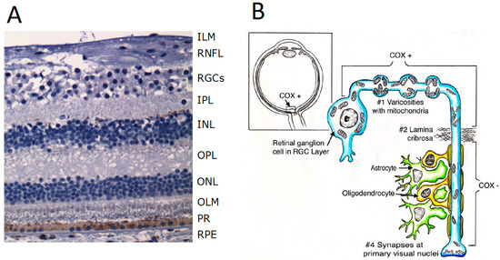 Anatomy of the retina and its connections. (A) A section of normal retina. ILM: inner limiting membrane; RNFL: retinal nerve fibres layer; RGCs: retinal ganglion cells; IPL: inner plexiform layer; INKL: inner neuronal layer; OPL: outer plexiform layer; ONL: outer neuronal layer; OLM: outer limiting membrane; PR: photoreceptors (inner segments); RPE: retinal pigmentary epithelium (modified from Maresca A, Carelli V, 2021 [18]). (B) The structure of the eyeball is outlined in the upper left inset and a retinal ganglion cell is outlined with the part of the axon (proximal to the lamina cribrosa, unmyelinated), as well as the initial part of the axon after the emersion from the lamina cribrosa, where it is myelinated by oligodendrocytes of the optic nerve. Notice the high number of mitochondria in the cell body and unmyelinated portion of the axon, often organized in mitochondrial “varicosities” compared with the few mitochondria present in the Ranvier nodes in the myelinated part of the axon (modified from Carelli V et al., 2004 [19]).