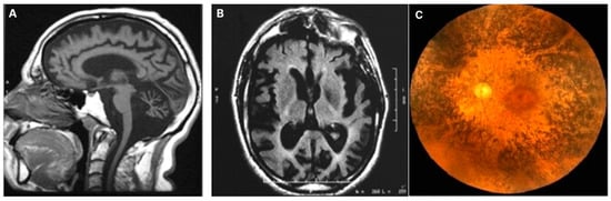 NARP/MILS. (A,B). FLAIR T2-weighted sagittal and transverse sequences of a patient with NARP/MILS (modified from Lopez-Gallardo, 2009 [46]). Profound cortical atrophy with enlargement of the ventricular system; severe cerebellar atrophy. (C). Fundus oculi showing retinal dystrophy in a patient with NARP/MILS.