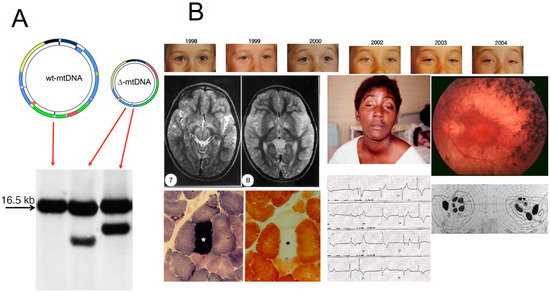 KSS: molecular and clinical synopsis. (A). Cartoon displaying the structure of wild-type and deleted mtDNA molecules, linearized, and subjected to Southern-blotting with audioradiography against purified radiolabeled human mtDNA. The upper band present also in the wild-type mtDNA indicates linearized normal mtDNA (wt-mtDNA). The lower bands present in the other two lanes corresponding to muscle DNA from KSS patients are deleted species (Δ-mtDNA) co-existing with wt mtDNA (heteroplasmy). (B). In the upper set of panels progression of bilateral ptosis in a KSS adolescent. Two FLAIR-T2 transverse brain sequences display multiple lesions. A transverse section of a muscle biopsy shows a ragged-blue fibre (SDH-hyperintense) associated with several COX-negative fibres. The lady depicted in the figure displays bilateral eyelid ptosis (with ophthalmoparesis) and facial weakness. Her ECG shows numerous extrasystolic aberrant impulses. On the left, the fundus oculi shows retinal dystrophy, with irregular defects of both visual fields (bottom).