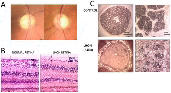 The retina in LHON. (A) Bilateral optic atrophy in chronic LHON. (B) In LHON the retinal neuronal fibres layer (NFL) and retinal ganglion cells (RGCs) layer are severely atrophic. Modified from from Maresca A and Carelli V, 2021 [18], H&E staining. (C) Loss of nerve fibres in a transverse section of the optic nerve of an LHON patient with the MT-3460 mutation, and in a magnified detail, compared with a control; Courtesy of Alfredo A. Sadun and Fred N. Ross-Cisneros.