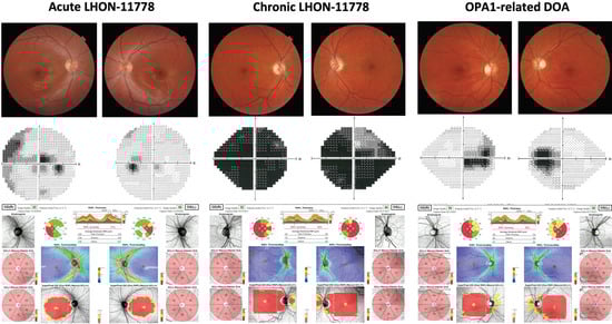 - Sadun, F.; De Negri, A.M.; Carelli, V.; Salomao, S.R.; Berezovsky, A.; Andrade, R.; Moraes, M.; Passos, A.; Belfort, R.; da Rosa, A.B.; et al. Ophthalmologic findings in a large pedigree of 11778/Haplogroup J Leber hereditary optic neuropathy. Am. J. Ophthalmol. 2004, 137, 271–277. [Google Scholar] [CrossRef]