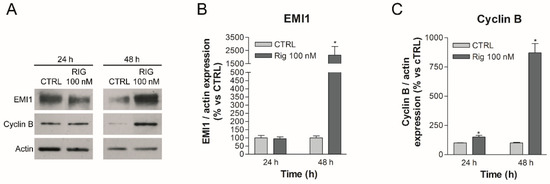 Western blot analysis of EMI1 and cyclin B in EGI-1 cells treated with Rig. (A) Representative images of EMI1, Cyclin B and actin after treatment with 100 nM Rig for 24 and 48 h. (B) The graph represents the quantification of EMI1 western blot, normalized to actin. (C) The graph represents the quantification of cyclin B western blot, normalized to actin. All the graphs are represented as the mean percentage ± SD of at least three independent experiments and are compared to untreated controls arbitrarily set to 100%. * p < 0.05 vs. CTRL.