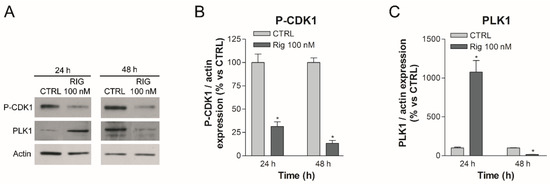 Western blot analysis of P-CDK1 and PLK1 in EGI-1 cells treated with Rig. (A) Representative images of P-CDK1, PLK1 and actin after treatment with different concentrations of 100 nM Rig for 24 and 48 h. (B) The graph represents the quantification of P-CDK1 Western blot, normalized to actin. (C) The graph represents the quantification of PLK1 western blot, normalized to actin. All the graphs are represented as the mean percentage ± SD of at least three independent experiments and are compared to untreated controls arbitrarily set to 100%. * p < 0.05 vs. CTRL.