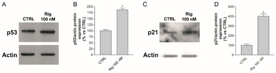 p53 and p21 expression in EGI-1 cells treated with Rig. (A) Representative image of p53 and actin Western blot after 24 h of treatment with Rig 100 nM. (B) The graph represents the quantification of p53 Western blot and data are represented as the mean percentage ± SD of p53 normalized to actin of three independent experiments, compared to untreated controls arbitrarily set to 100%. (C) Representative image of p21 and actin Western blot after 24 h of treatment with Rig 100 nM. (D) The graph represents the quantification of p21 Western blot and data are represented as the mean percentage ± SD of p21 normalized to actin of three independent experiments, compared to untreated controls arbitrarily set to 100%. * p < 0.05 vs. CTRL.
