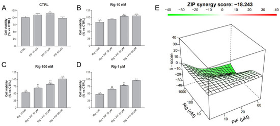Cell viability of EGI-1 cells treated with different combinations of Rig and PIF. EGI-1 cells were treated for 24 h with different concentrations of PIF (0, 10, 20, 60 µM), alone (A) or in combination with Rig 10 nM (B), Rig 100 nM (C) and Rig 1 µM (D). Graphs are represented as the mean percentage ± SD compared to untreated control (CTRL), arbitrarily set to 100%, from at least three independent experiments. The antagonism of Rig and PIF combinations is calculated by the Synergy Finder web application and is represented in graph E: a green color indicates an antagonistic effect, a white color an additive effect, and a red color a synergistic effect. * p < 0.05 and ** p < 0.01 vs. CTRL; °° p < 0.01 vs. respective Rig.