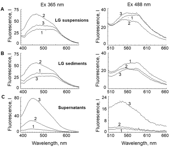 Importantly, in the supernatant obtained from the original LG suspension, the fluorescence intensity was very low, indicating a low content of hydrophilic oxidized forms of LG fluorophores (Figure 1C, spectra 1 at fluorescence excitations of 365 and 488 nm). However, after oxidation of the LG suspension, the fluorescence intensity of the supernatants increased sharply in the short-wavelength region of the spectrum (450 nm, Ex. 365 nm; 550 nm, Ex. 488 nm). This was particularly apparent in LG suspension exposed to superoxide radicals (Figure 1C, spectra 3, fluorescence excitations 365 and 488 nm).