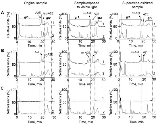 HPLC analysis of chloroform extracts from the studied samples in Figure 1. (A) lipofuscin granule (LG) suspension, (B) LG sediment, and (C) supernatant. Vertical dotted lines indicate groups of peaks: (gr1), group of peaks corresponding to BisRet-OX, containing mono- and bis-oxy A2E; and (gr2), group of peaks corresponding to bisretinoids and their oxidized forms. Detection at wavelengths of 430 nm (1) and 365 nm (2).
