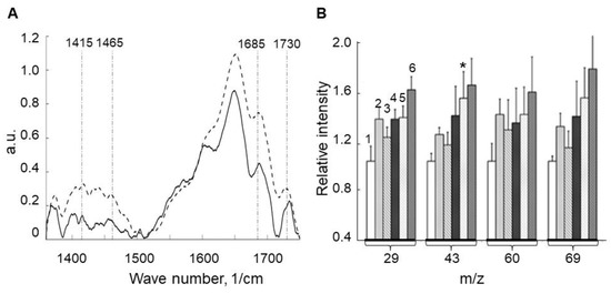 (A) Averaged Raman spectra for lipofuscin granule (LG) suspensions before (solid line) and after (dotted line) visible light irradiation for 100 min. Three independent experiments were conducted. In each experiment, 25 spectra were obtained (p < 0.05). (B) Time-of-flight secondary ion mass spectrometry (ToF–SIMS) analysis of LG suspensions before irradiation (1) and after visible light irradiation for 2 (2), 10 (3), 40 (4), 100 (5), and 160 (6) min. On the abscissa axis, the numbers correspond to the mass of positive fragment ions, containing carbonyl groups (29: CHO+; 43: C2H3O+; 60: C2H4O2+; 69: C4H5O+). On the ordinate axis, the relative intensities of the corresponding positive fragment ions are plotted as relative units. Data are presented as means ± SD from nine independent experiments. * p < 0.01.