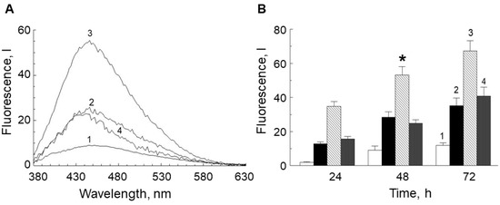 (A) Fluorescence spectra of photoreceptor outer segment (POS) suspensions after 48 h incubation in the dark with (1) control without additives; (2) supernatant from the original lipofuscin granule (LG) suspension; (3) supernatant from LG suspension irradiated with visible light for 60 min; and (4) supernatant from LG suspension irradiated with visible light for 60 min, and in the presence of aminoguanidine (4 mM). The fluorescence excitation wavelength was 365 nm. (B) Dynamics of the increase in intensity of POS suspension fluorescence after incubation in the dark for 24, 48, and 72 h. The column designations correspond to the designations of the samples on panel (A). Data are presented as means ± SD from three independent experiments. * p < 0.05.