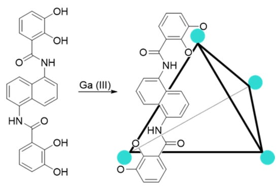 Nitrones are 1,3-dipoles of the allyl anion type, used to synthesize isoxazolidines by reaction with dipolarophiles, such as alkenes and acetylenes [9,10]. Generally, nitrones are obtained in dry conditions and purified employing a chromatographic column [11]. The tetrahedral capsule as a confining nanoreactor allowed us to synthesize these substrates using water as a solvent and separate them by extractions with organic solvents. The supramolecular system is self-assembled by six bis-bidentate ligands and four metal ions to form a cage with metal atoms at the tetrahedron vertices. As demonstrated by the crystallographically obtained geometric parameters and its T symmetry, the tetrahedron has ligands that cross the six edges. The ligand is N,N’-(naphthalene-1,5-diyl)bis(2,3-dihydroxybenzamide), consisting of a naphthalene core and two catechol groups capable of complexing the Ga3+ that constitute the vertices of the tetrahedron (Figure 1) [1].