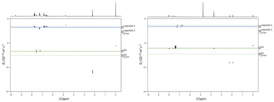 The association constant Ka can be calculated exploiting a single-point procedure on the assumption of the known xHG (2a or 4a) (Equation (2)) [23,24]. This procedure assumes that the diffusion coefficient of the host–guest complex (2a@1 and 4a@1 complexes) is the same as that of the host molecule (capsule 1). This is because the host molecule is usually very much larger than the guest, so it seems reasonable to assume that the diffusion coefficient of the host–guest complex is the same as that of the host molecule (a measurable quantity).