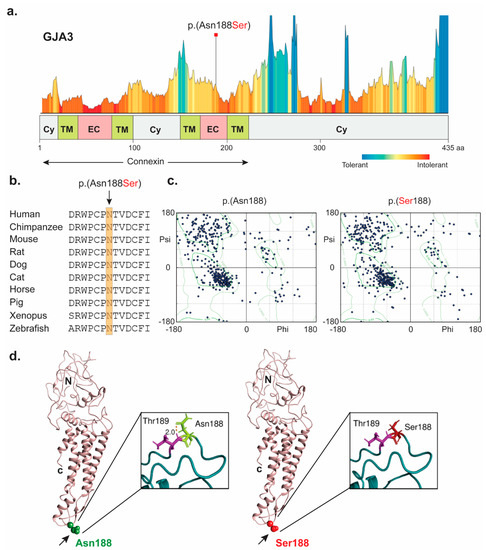 - Schadzek, P.; Schlingmann, B.; Schaarschmidt, F.; Lindner, J.; Koval, M.; Heisterkamp, A.; Preller, M.; Ngezahayo, A. The cataract related mutation N188T in human connexin46 (hCx46) revealed a critical role for residue N188 in the docking process of gap junction channels. Biochim. Biophys. Acta (BBA)-Biomembr. 2016, 1858, 57–66. [Google Scholar] [CrossRef] [PubMed] [Green Version]