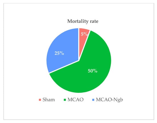 The mortality rate was assessed by calculating the percentage of animals in each experimental group that survived the MCAO intervention, but died within the 24 h of reperfusion period.
