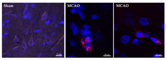 Confocal microscopy images of histological sections of the infarcted zone from sham (left) and MCAO (middle and right) animals taken 24 h after the systemic injection of the hyaluronate NPs. Several nervous cells, whose nuclei are stained in blue with DAPI, show empty NPs grouped as cytoplasmic red vesicles due to its labelling with rhodamine fluorescent dye.