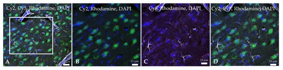 Confocal microscopy images from the infarcted zone of MCAO animals taken 24 h after the systemic injection of the Ngb-NPs. (A) Cy2 green fluorescence represents Ngb. (B) Rhodamine red fluorescence detects NPs. (C) DAPI blue fluorescence marks cell nuclei. (D) Merge image showing the colocalization of Ngb and NPs inside the nervous cells. Ngb attached to NPs appears in yellow, due to green and red merge.