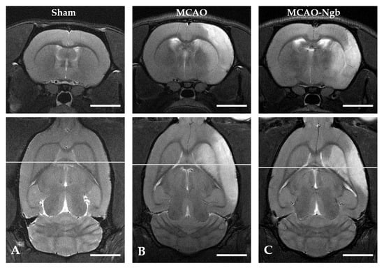 Cerebral T2 axial and coronal neuroimages of sham, MCAO, and MCAO-Ngb animals taken after 24 h of reperfusion. The infarcted area is visible in images (B,C) in white, but not in (A). Scale bars: 5 mm.