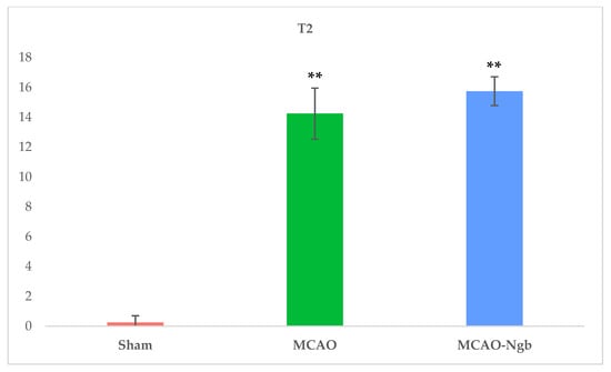 Mean values of the volume of the infarcts in sham, MCAO, and MCAO-Ngb groups calculated from the T2 neuroimages. Data have been calculated using ImageJ software, and are expressed in arbitrary units. Data are average values of six experimental animals in each group (** p < 0.01).