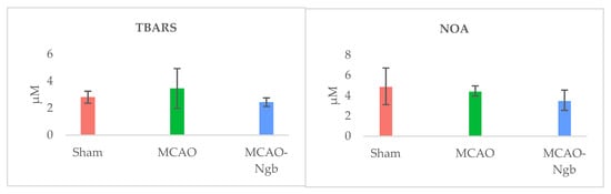 The determination of the oxidative (TBARS) and nitrosative stress (NOx) in the tissues of MCAO and MCAO-Ngb animals also showed non-significant changes in relation to sham animals (Figure 8).
