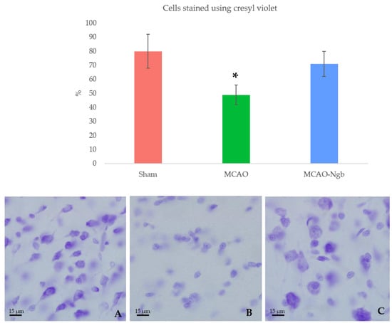 Upper panel: percentage of cells stained by cresyl-violet for each group: sham (A), MCAO (B), and MCAO-Ngb (C), measured using ImageJ. Animals from MCAO group show fewer neurons than rats from sham and MCAO-Ngb groups. Data are average values of 5 repetitions in 10 sections of 5 experimental animals in each group (* p < 0.05). Lower panel: representative microphotographs of the infarct zone (parietal cortex) of animals stained with cresyl-violet.