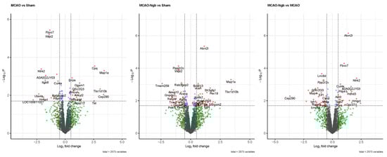 Volcano plots for the three comparisons using p < 0.02 and Log2 fold change of 0.5 as threshold. When comparing MCAO vs. sham, proteins FBXO7, WIPI2, NTRK2, A0A0G2JY03, and ITGB8 are underexpressed, whereas MAP1a and CPQ are overexpressed. In the comparison between MCAO-Ngb and sham, proteins PPP2r2c, WIPI2, and LRRC8d are shown to be underexpressed, whereas ATXN2l, MAP1a, and TBC1d10b are overexpressed. The comparison between MCAO-Ngb and MCAO involves the over expression of ATXN2l, FBXO7, and NTRK2.