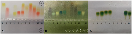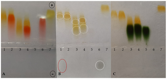 Then, the complexes formed on the basis of the TY-Ag complex were analyzed in a molar ratio of 1:0.8 (Figure 2). Sample 1 shows a slight trace of unbound silver traveling towards the cathode, while the addition of CR in sample 2 completely binds the silver in the complex (CR-TY-Ag). CR increases the solubility of the TY-Ag complex (Figure 2B). The complexed silver is visible in both sample 3 (BSA-TY-Ag) and sample 4 (BSA-CR-TY-Ag). Due to the positive charge of Ag+, it binds to TY or TY-CR in albumin (Figure 2C). Non-protein bound TY-Ag complexes (samples 3 and 4) can also be observed, migrating faster than BSA-TY-Ag and BSA-CR-TY-Ag to the anode (Figure 2C). Albumin in these complexes travels to the anode faster than free BSA (sample 5) (Figure 2C). Congo red does not bind Ag+—migration towards the cathode is visible (sample 6) (Figure 2A).
