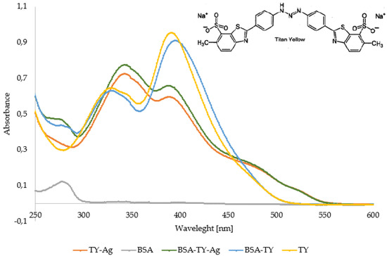 Comparison of UV/VIS spectra of TY, TY-Ag, BSA, BSA-TY, and BSA-TY-Ag. Changes in the spectrum in the emerging complexes are visible.