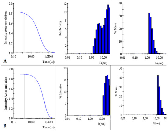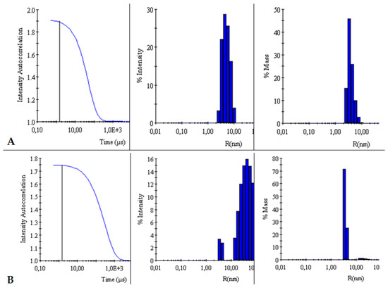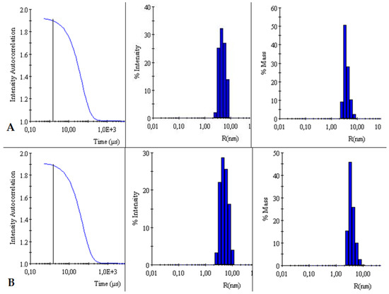 Comparison of intensity autocorrelation curves, % of intensity and % of the mass of: (A): TY and (B): TY-Ag.