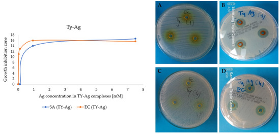 The complexes with the TY-Ag molar ratio of 1:0.5 were analyzed, which, according to the results of the electrophoresis, were characterized by the complete binding of AgNO3 by TY. The concentration of silver in all analyzed samples was 4.7 mM, which was a value well above the MIC for both analyzed strains. Modified Kirby–Bauer method was used (agarose wells instead of disks).