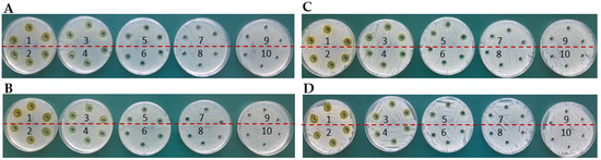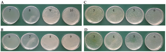 Determination of MBC on MHA agar plates for E. coli in the presence of complexes: (A): TY-Ag (1:0.5) (last of concentration No. 8: 0.036 mM); (B): BSA-TY-Ag (last of concentration No. 7: 0.07 mM); MBC determination for S. aureus in the presence of complexes: (C): TY-Ag (1:0.5) (above concentration No. 3: 1.12 mM—MBC not determined); (D): BSA-TY-Ag (TY-Ag = 1:0.5; BSA-TY = 1:10) (above concentration no. 3: 1.12 mM—MBC has not been determined). The ranges of silver concentrations (serial two-fold dilutions) were analyzed from 1.12 mM (No. 3) to 0.008 mM (No. 10).