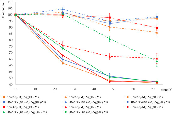 T24 cell proliferation expressed as % of control after addition of Ag+ (20 µM) (solid lines) complexed with TY (20 µM) (yellow), BSA-TY(20 µM) (blue), TY (40 µM) (red) and BSA-TY (40 µM) (green) separately; Ag+ (15 µM) (dashed lines) complexed with TY (20 µM) (yellow), BSA-TY (20 µM) (blue), TY (40 µM) (red) and BSA-TY (40 µM) (green) separately; Ag+ (10 µM) (dotted lines) complexed with TY (20 µM) (yellow), BSA-TY (20 µM) (blue) and TY (40 µM) (red) separately.