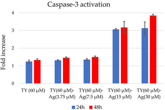 The concentration of TY used in each sample was 60 µM (to check the TY effect at a dose minimal higher than the designated IC50), while the concentration of silver was variable. Concentrations of TY-complexed silver of 15 µM and 30 µM (TY(60 µM)-Ag(30 µM) = 1:0.5 molar ratio; TY(60 µM)-Ag(15 µM) = 1:0.25 molar ratio) caused Cas 3 activation, indicating apoptosis induction. The other concentrations of silver complexed with TY, namely 7.5 µM and 3.75 µM (TY(60 µM)-Ag(7.5 µM) = 1:0.125 molar ratio; TY(60 µM)-Ag(3.75 µM) = 1:0.625 molar ratio) had no effect of Cas 3 activation, just as free TY (Figure 13).