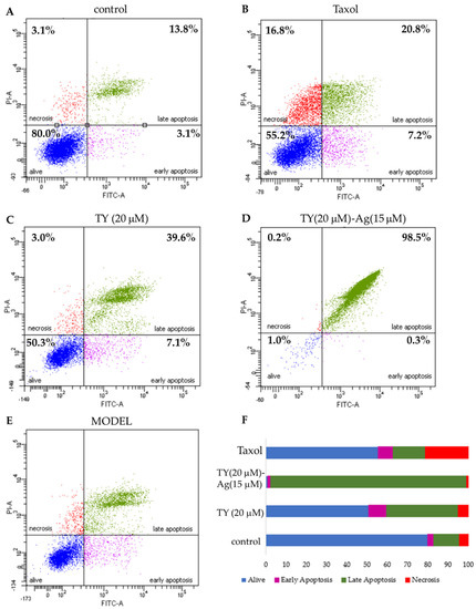 The effect of TY and TY-Ag complex on apoptosis and necrosis of T24 cells. The images show flow cytometry analysis of Annexin-V and PI staining presented in a dot-plot graph; (A): negative control; (B): positive control with taxol (50 nM); (C): T24 cells were incubated with TY (20 µM concentrations), (D): TY-Ag (TY 20 µM and Ag+ 15 µM concentrations); (E): graphic representation of four cell states: alive - the lower-left square; cells undergoing necrosis—the upper left square; cells in early apoptosis - the right lower square; and cells in late apoptosis the upper right square; (F): Cumulative bar charts show the inter-relation between the state of T24 cells after 48 h exposure to TY (20 µM), TY(20 µM)-Ag(15 µM), and taxol.