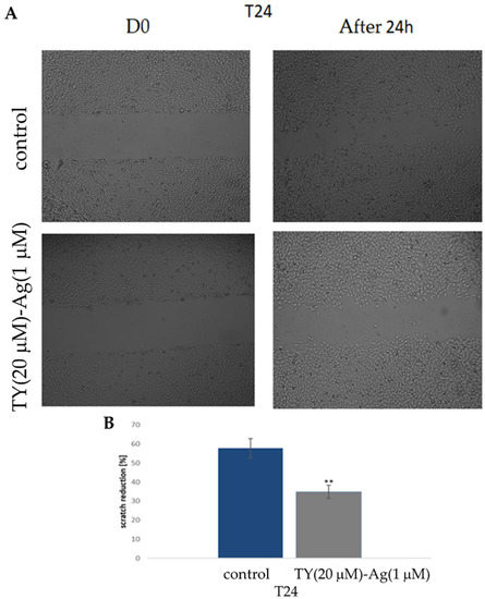 The T24 cell lines were treated with TY(20 µM)-Ag(1 µM) complex, and the cell migration was evaluated with a wound-healing test/scratch assay. A significant reduction in cell motility was observed upon exposure to TY(20 µM)-Ag(1 µM) (Figure 15). Optical images show scratch overgrowth with time for T24 cells (Figure 15A). The photographs were captured immediately after wounding as well as 24 h later with the corresponding control (non-treated cells). Non-treated cells almost entirely closed the wound in approximately 24 h while the scratch remained open in cells treated with TY(20 µM)-Ag(1 µM). These results indicate that the motility of the T24 cell line was significantly inhibited by the presence of TY(20 µM)-Ag(1 µM) after 24 h. The percentage effect of scratch reduction is shown in Figure 15B.