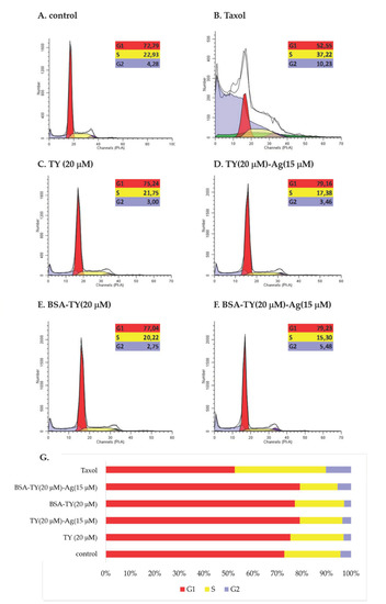 The effect of (B): taxol, (C): TY, (D): TY-Ag, (E): BSA-TY, and (F): BSA-TY-Ag on the cell cycle of T24 cells. (A): control; (G): percent of cells at G1, S or G2 phase of cell cycle.