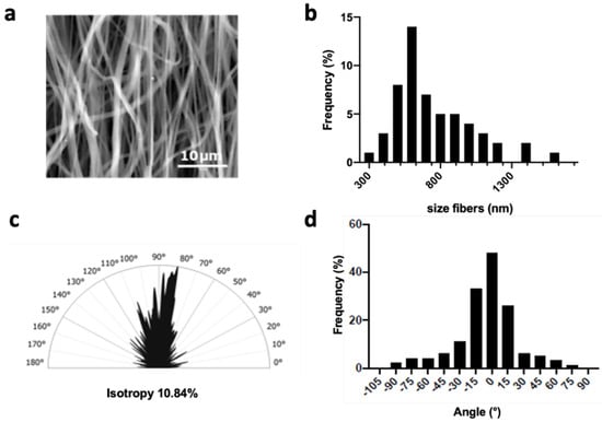Characterization of electrospun fibers. (a) SEM images showing the electrospun fibers, (b) fiber size distribution (n = 100 fibers), (c) analysis of fiber orientations according to the principal directions using Fourier transform, and (d) half-polar smoothed curve of the orientation of the fibers from SEM image analysis (n = 3).