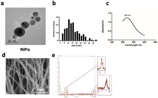 Characterization of the gold nanoparticles coated on the PCL scaffold. (a) TEM images of Au nanoparticles formed on the fibers, (presenting a s ize of 15 ± 6 nm ). (b) Particle size distribution from TEM image analysis (n = 30 particles) and (c) absorption spectrum of gold nanoparticle solutions using a spectrometer, with a peak of absorbance at a wavelength of 520 nm (n = 3). (d) SEM images of electrospun fibers coated with Au NPs, (e) EDS spectrum showing the 3 peaks for Au elements at 2.10, 2.20, and 9.7 keV.