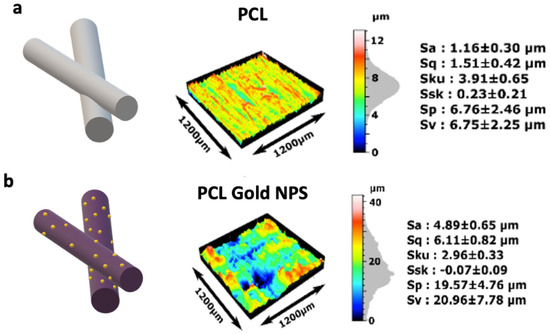 Topography of the PCL scaffolds coated or not with gold nanoparticles. Sensofar Confocal profiler measurement of the surface of (a) PCL and (b) PCL coated with gold nanoparticles. The features used to evaluate the surface roughness of the material were height parameters (Sv), valleys and peaks (Sp), including arithmetical mean height (Sa), and root mean square height (Sq). Skewness (Ssk) represents the degree of symmetry of the surface heights about the mean plane, while kurtosis (Sku) indicates the randomness of height and the sharpness of the structures on the surface (n = 3 for each condition).