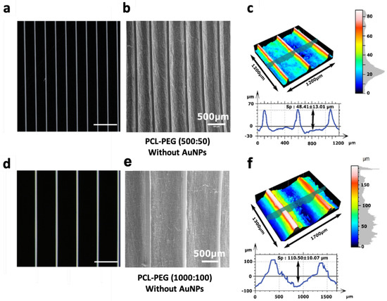 Two masks with linear patterns were selected to create PEG hydrogel lines (Figure 4a,d) on the previously produced scaffolds. They were spaced either 500 µm or 1000 µm apart, with a width of 50 or 100 µm, respectively (named 500:50 and 1000:100). Photolithography made correct PEG hydrogel line deposits possible and attached well to the electrospun fibers. SEM images (Figure 4b,e) demonstrated that the hydrogel microstructure, where deposited, fully covered the PCL structure, leaving no fibers exposed at the top surfaces of the micropatterns. No damage to the morphology of the fibers located in between the hydrogels was observed (Figure 4e). We noticed a difference by comparing the masked data with the corresponding polymeric replica obtained from the electrospun fibers. Profilometry measurements (Figure 4c,f) confirmed the SEM observations. The PEG lines in both patterns had a height of about 40 µm, but their widths showed an average of 108 µm and 124 µm instead of the expected 50 µm and 100 µm, respectively. This resulted in reduced mean spacing between two lines, of 377 µm and 921 µm for the 500:50 and 1000:100 patterns, respectively. However, this difference was significant enough to evaluate the effect of spacing on cell behavior. The Sensofar confocal analysis demonstrated that the sheet tends to bend between the PEG lines and this effect was more significant on the 1000:100 pattern, with a variation in height of 110.40 ± 9.9 µm, whereas it was only 44.46 ± 16.17 µm for the 500:50 pattern.