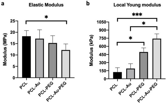 At the global scale, the issue is producing a scaffold that is easy to handle and capable of sustaining mechanical stretching cycles. Figure 5a shows the elastic moduli of the electrospun fibrous scaffolds before and after Au NP coating or hydrogel patterning. Based on the stress–strain curves, electrospun sheets coated or not with Au NPs display similar elastic moduli of 16 ± 2.5 MPa and 19.5 ± 3.0 MPa, respectively. After the addition of PEG hydrogel lines with a spacing of (500:50) on scaffolds, the mechanical properties slightly decreased to 14.8 ± 3.1 MPa for PCL-PEG and 12.2 ± 2.1 MPa for PCL-Au-PEG.