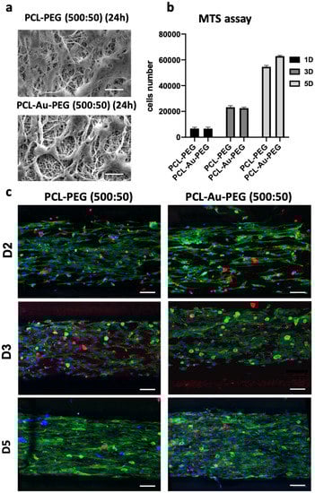 Cell adhesion was investigated on (500:50) PCL-PEG and PCL-Au-PEG. SEM images (Figure 6a) show C2C12 cells attached and distributed on the scaffolds at 24 h, which confirmed that both scaffolds could support the attachment and proliferation of myoblasts. Cell proliferation assay revealed that the cells displayed the same growth characteristics on the different materials, with threefold growth (Figure 6b). A difference appeared on D5, with greater proliferation of cells on the material with gold nanoparticles. A Far Red assay was performed to investigate the viability of the C2C12 cells on the composite materials (Figure 6c). After 5 days it was evaluated that 13.2 ± 3% and 20.8 ± 5.5% of the C2C12 cells were dead (red staining) on PCL-PEG and PCL-Au-PEG scaffolds, respectively. These tests indicate that neither substrate induced any cytotoxicity. On these confocal observations, cell proliferation and changes in shape could also be followed from day 2 to day 5.