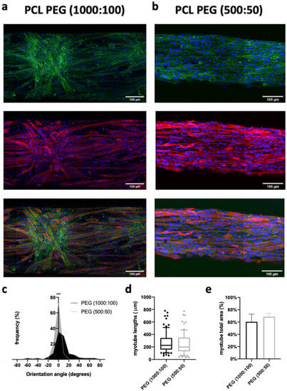 Finally, we evaluated the effects of spacing micropatterns on PCL scaffold (500:50 vs. 1000:100) on the differentiation of C2C12 myoblasts into myotubes, as well as on their spatial orientation. On day 7, cells were immunostained with myosin heavy chain (MHC), an indicator of myotube formation. Confocal microscopy images confirmed that under partial serum deprivation (2% of horse serum) for 5 days, myoblasts fused into myotubes on the scaffolds (Figure 7a,b). Moreover, confocal images of fluorescent stained F-actin on cells demonstrated that the actin assembly appeared perfectly oriented along the fibers and pattern structure for the PEG samples (500:50). In contrast, in some parts of the PEG sample (1000:100), on the apparent strata of cells, the actin could appear disordered. Yet, it was interesting to observe that those cells were not in direct contact with the PCL fibers, but lay on other cells and tended to assemble and arrange into spiral-like patterns (Figure 7a). In comparison, the cells in direct contact with PCL nanofibers formed elongated myotubes assembled into parallel patterns. Muscle-like cells were found to be arranged mostly in parallel with the patterned hydrogel. For the PCL-PEG (500:50), i.e., the narrow configuration, all angles formed by the myotubes with the direction of the PEG lines were found in the range −15°/ + 15°, with a mean value of −0.9° ± 5. When the space between two PEG lines increased (PCL-PEG 1000:100), only 72% of the angles were in this range, with a mean value of 7.35° ± 21.95° (Figure 7c). Analysis of the confocal images in (Figure 7d) showed that the length of the myotubes was not significantly higher with the wider spacing patterns. Very interestingly, some myotubes presented lengths in the range of 800 µm. Finally, myotubes that formed on PCL-PEG (500:50) covered 8% more surface area than on the PCL-PEG (1000:100) (Figure 7e). In both cases, surface coverage was very high. One limitation of electrospun scaffold regarding direct cell observation comes from its opacity: it was not possible to evaluate if C2C12 were able to spontaneously contract, as is commonly observed in plastic culture dishes.