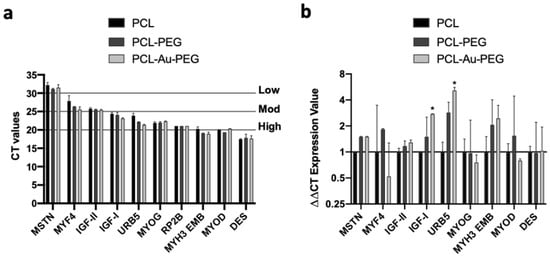 Finally, to assess the terminal differentiation of the C2C12 myoblasts on the PCL constructs we analyzed nine genes that regulate myoblast differentiation and myotube maturation. These corresponded, from the least to the most matured status, to myostatin (MSTN), myf4, IGF-I/II, myoD, URB5, myogenin (MYOG), myosin heavy chain 3 embryonic (MYH3 EMB), and desmin. The basal Ct values suggest that eight out of 10 genes (including the reference gene: RP2b) were between 20 and 25, indicating a high to moderate gene expression profile (Figure S4). Myostatin, a negative regulator of muscle mass, displayed the lowest expression levels for all treatments, and desmin expression was the highest (Figure 8a). Interestingly, the highest tertile of expression comprised myogenic regulatory factors and embryonic myosin, which also increased during regeneration. Next, the Ct expression values were quantified, following normalization with the basal Ct values of the housekeeper gene (RP2b) and the experimental control (PCL statical) at 7 days (Figure 8b). There was no difference in myostatin expression between PCL-PEG and PCL-Au-PEG constructs vs. control. Myf4 expression increased non-significantly by 2.9 and 3.6 in PCL-PEG vs control and PCL-Au-PEG, respectively. There was no difference in IGF-II expression across experimental conditions. However, there was a significant, 2.5-fold increase and a small, but non-significant 1.9-fold increase in IGF-I expression in PCL-Au-PEG vs. control and PCL-PEG respectively. Strikingly, there was a non-significant 2.8-fold and a significant 5.1-fold increase in URB5 expression vs. control. Further, there was 1.8 times greater URB5 expression in PCL-Au-PEG vs. PCL-PEG, although significance was not achieved. Despite small 1.5 and 1.8-fold increases in MYH3 EMB expression in PCL-PEG and PCL-Au-PEG vs. control, significance was also not achieved. Lastly, there was no impact of treatment on the myogenic regulatory factors Myogenin, MyoD, or desmin. However, these genes were among those with highest expression basally (basal Ct values).