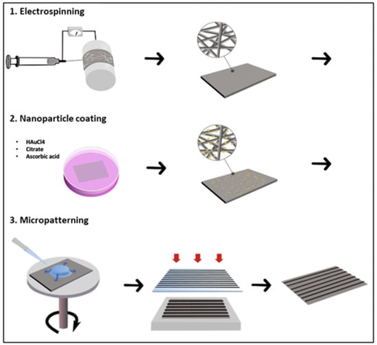 Schematic illustration showing the three steps in the manufacturing process: (1) electrospinning of PCL on drums at high velocity; (2) the nanoparticle coating process, including the successive addition of gold [HAuCl4], citrate, and ascorbic acid solutions to the scaffold immersed in milliQ water; and (3) soft photolithography of polyethylene glycol (PEG) hydrogel, with 50 µm or 100 µm width line patterning and spaced 500 µm or 1000 µm.